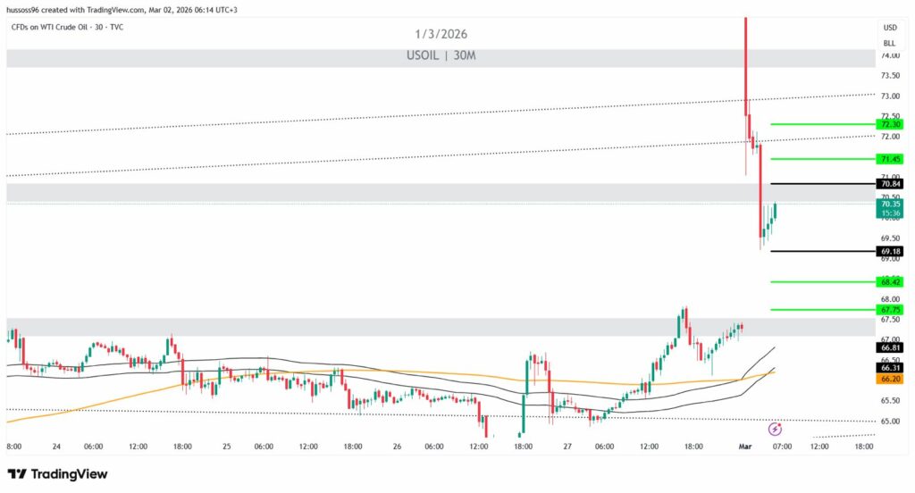 ملاحظة: النفط في موجة اندفاع قوية، وأي تراجع فوق 69.18 يبقى ضمن إطار التصحيح الطبيعي