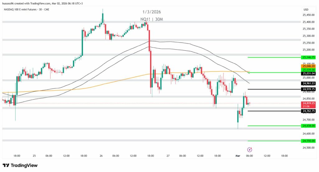 ملاحظة: الاتجاه تحول إلى هابط بعد كسر المتوسطات وإعادة الاختبار، وأي صعود حالياً يعتبر تصحيح ما لم يتم اختراق 25,039 بثبات