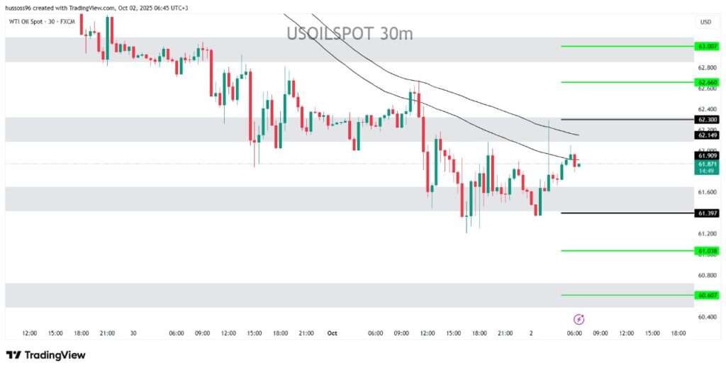 التعليق: النفط يتحرك بتذبذب قرب منطقة دعم، الاتجاه القادم يعتمد على كسر 61.39 أو اختراق 62.30.