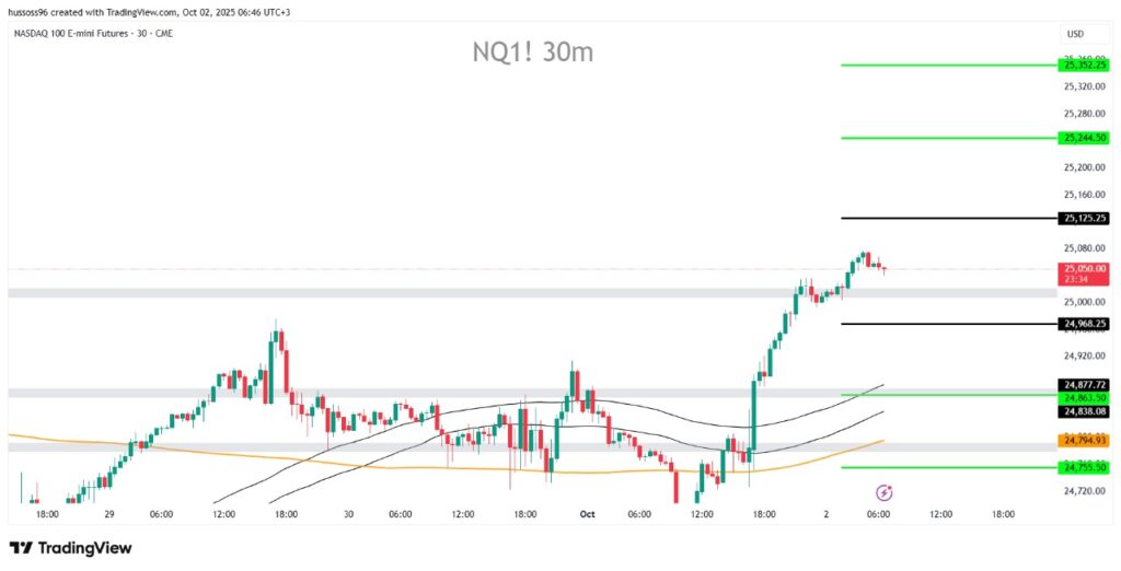 السيناريو الأول: شراء ناسداك باختراق والثبات أعلى 25,125 مع استهداف 25,244 ثم 25,352