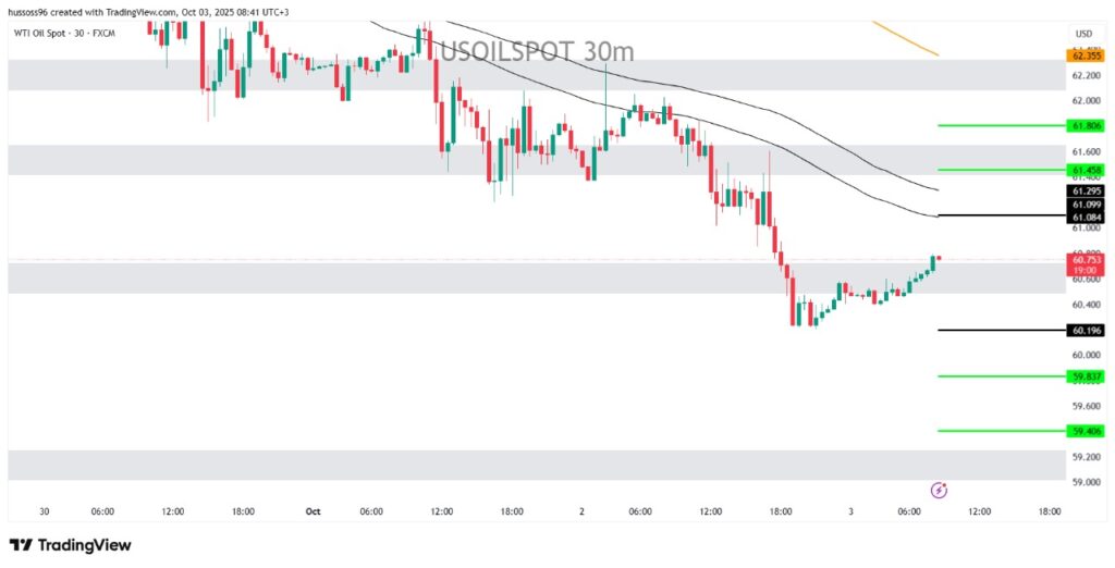 التعليق: النفط يتداول قرب منطقة عرض، وأي كسر لمستوى 61.09 أو نزول أسفل 60.19 سيحدد المسار بوضوح.