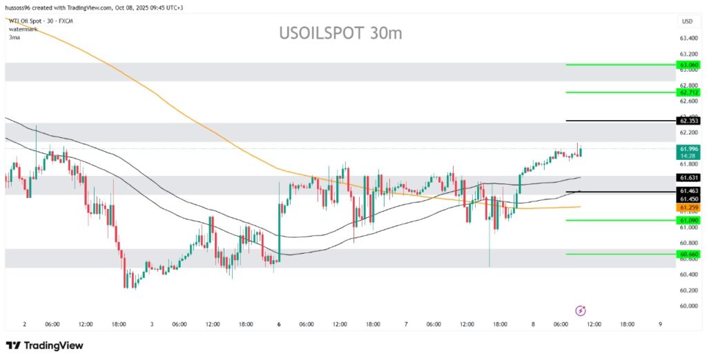 التعليق: النفط يتحرك في نطاق تذبذب أفقي، لكنه يُظهر محاولات صعود قوية. الإغلاق فوق 62.35 قد يُفعّل موجة جديدة نحو 63.00.