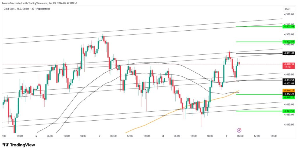 ملاحظة: الذهب يحافظ على تماسكه داخل القناة الصاعدة، والكسر أسفل 4,454 يضعف الزخم الإيجابي.