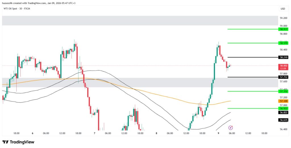 ملاحظة: الارتداد قوي لكن السعر يواجه مقاومة قريبة، واختراق 58.21 شرط لاستمرار الصعود.
