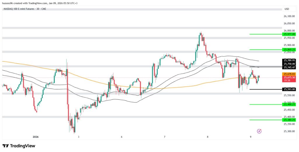 ملاحظة: السعر يتداول أسفل المتوسطات المتحركة، والضغط البيعي ما زال قائم ما لم يتم اختراق 25,745 بثبات.
