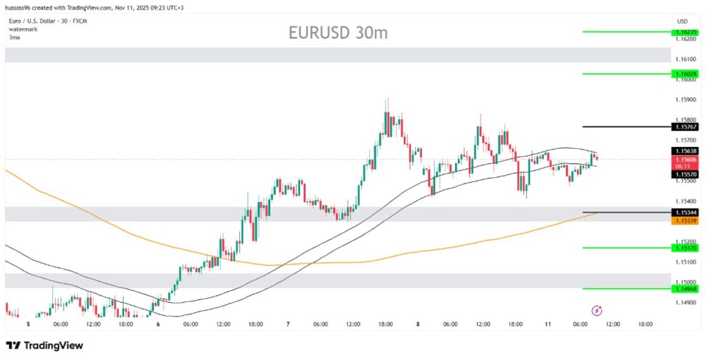 التعليق: اليورو يتحرك قرب مستوى 1.1560 وسط ضعف الزخم، والميل العرضي يسيطر حالياً، بانتظار اختراق واضح لتحديد الاتجاه القادم.