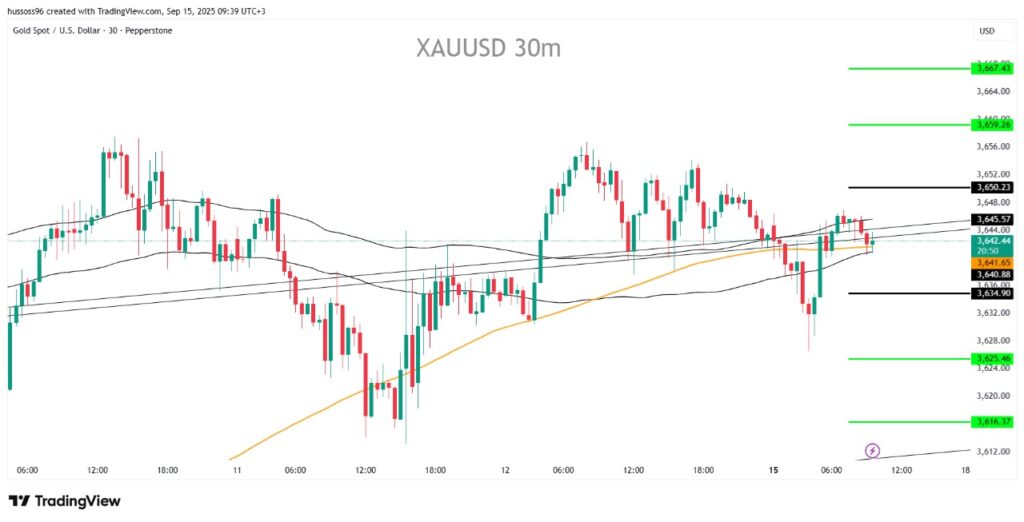 السيناريو الأول: شراء الذهب بكسر والثبات أعلى 3,650.23 مع استهداف 3,659.26 ثم 3,667.43