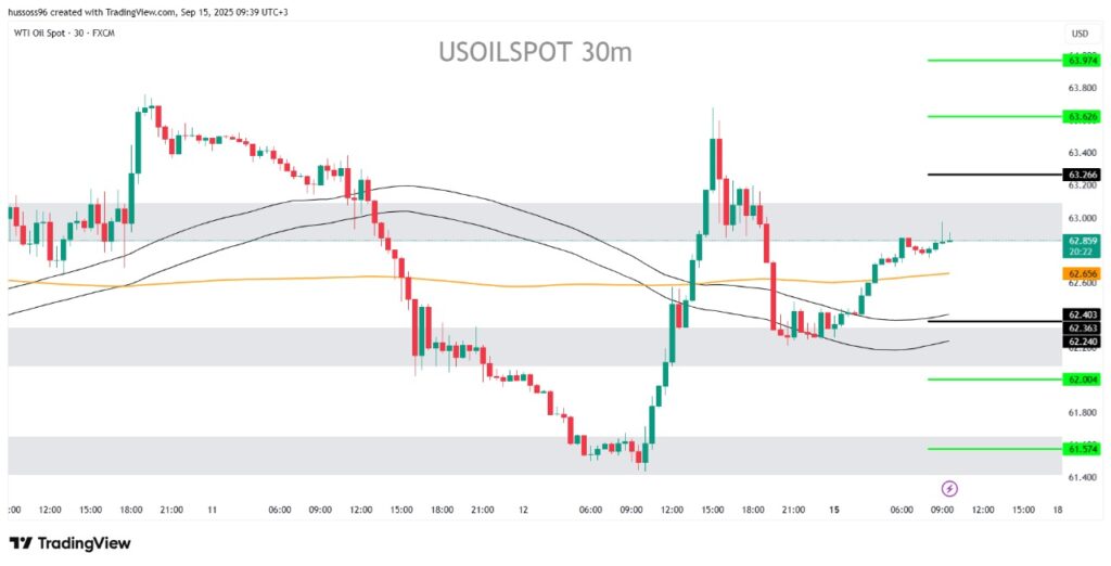 السيناريو الأول: شراء النفط بكسر والثبات أعلى 63.266 مع استهداف 63.626 ثم 63.974