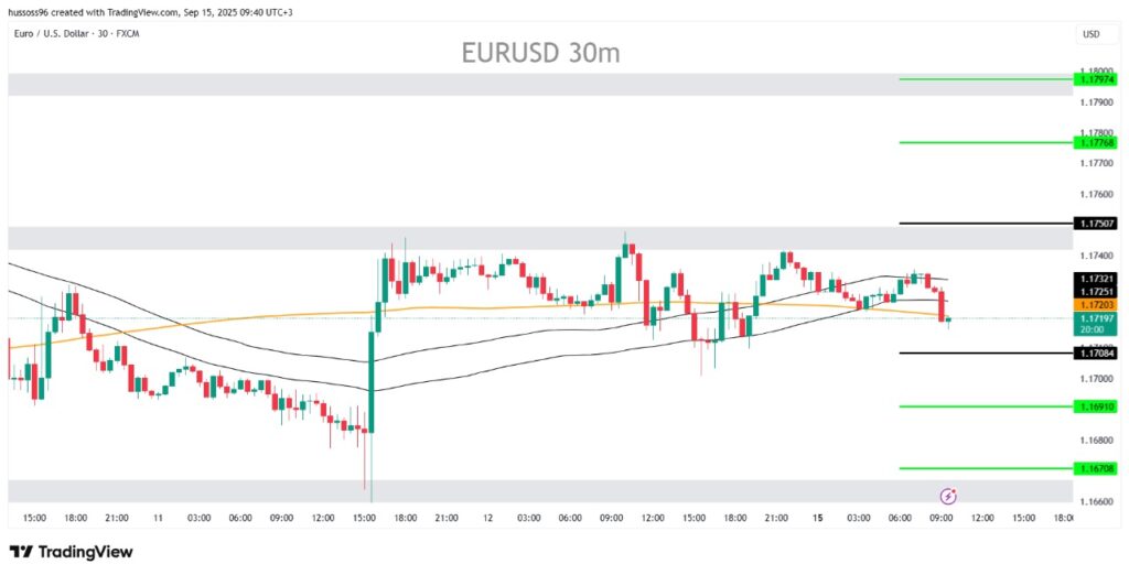 السيناريو البديل: بيع اليورو بكسر والثبات أسفل 1.17084 مع استهداف 1.16910 ثم 1.16708