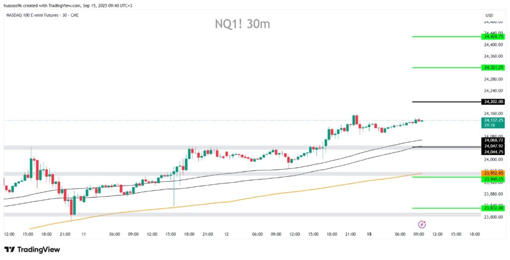 السيناريو الأول: شراء ناسداك بكسر والثبات أعلى 24,202.00 مع استهداف 24,321.25 ثم 24,428.75