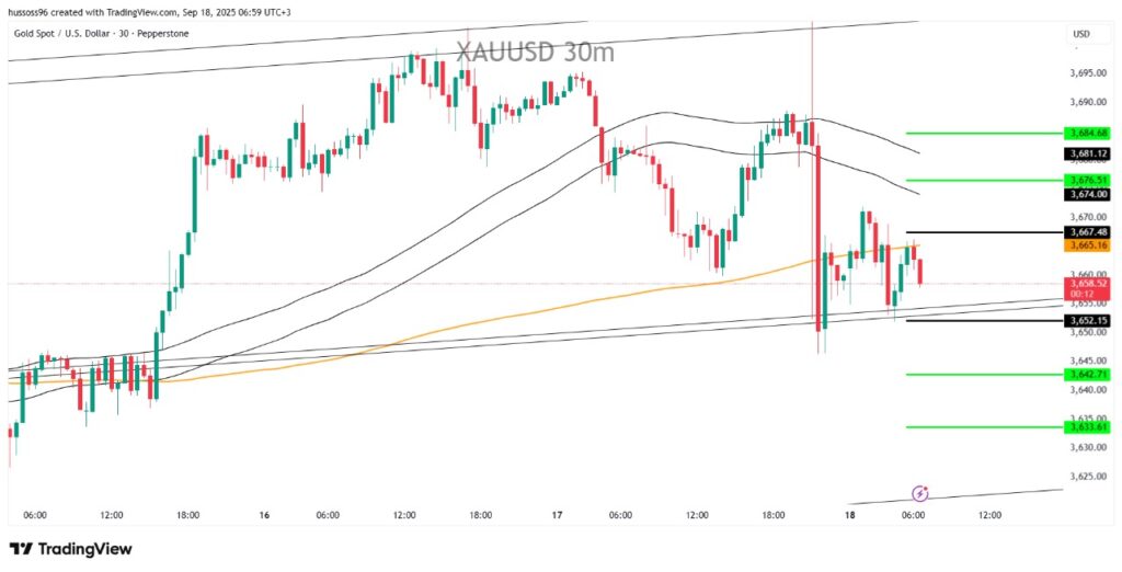 السيناريو البديل: بيع الذهب بكسر والثبات أسفل 3,652.15 مع استهداف 3,642.71 ثم 3,633.61