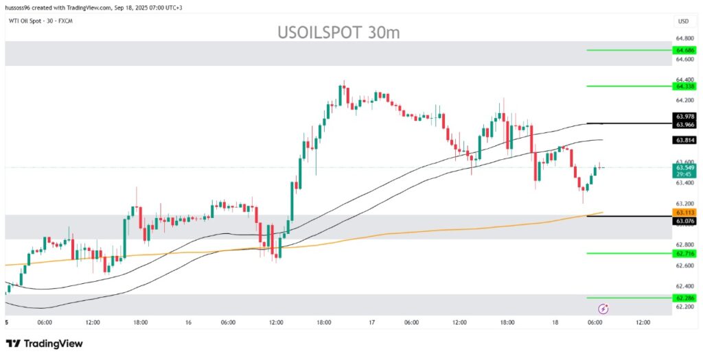 السيناريو الأول: شراء النفط بكسر والثبات أعلى 63.966 مع استهداف 64.338 ثم 64.686