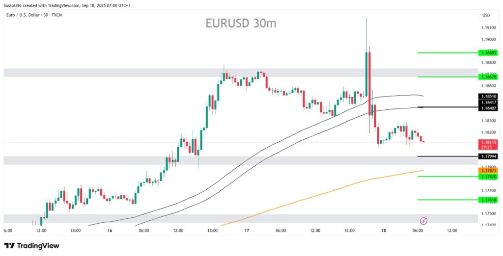 السيناريو البديل: بيع اليورو بكسر والثبات أسفل 1.17994 مع استهداف 1.17820 ثم 1.17618