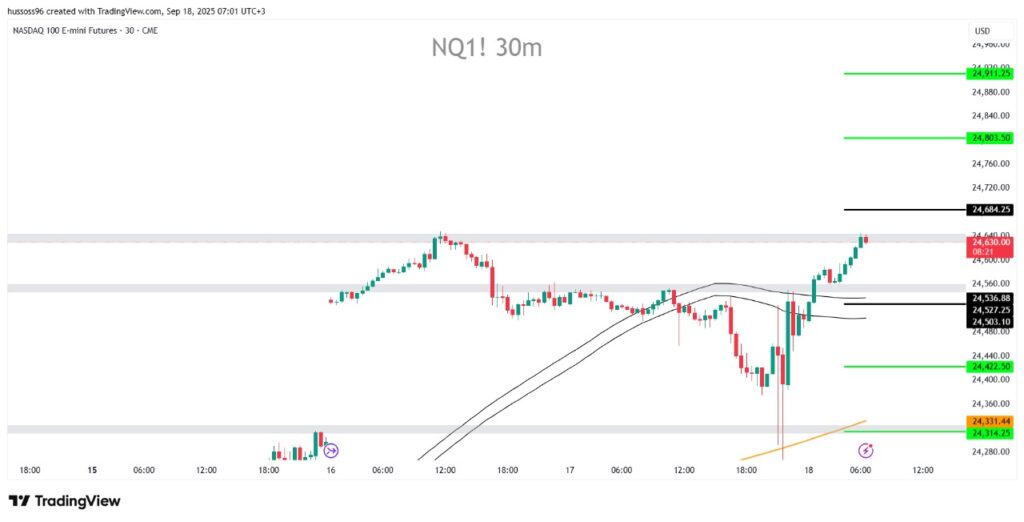 السيناريو الأول: شراء ناسداك بكسر والثبات أعلى 24,684.25 مع استهداف 24,803.50 ثم 24,911.25