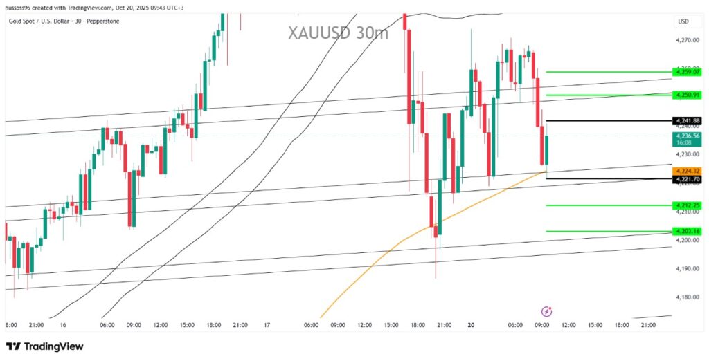 التعليق: الذهب ما زال يتحرك ضمن قناة صاعدة قوية ويحترم المتوسط 200 (البرتقالي) كمستوى دعم ديناميكي. أي ثبات فوق 4,221 يعزز فرص الصعود مجدداً نحو قمم الأسبوع الماضي.