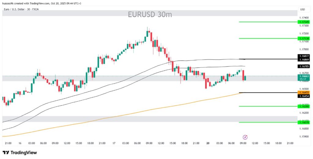 السيناريو الأول: شراء اليورو باختراق والثبات أعلى 1.1678 مع استهداف 1.1713 ثم 1.1734