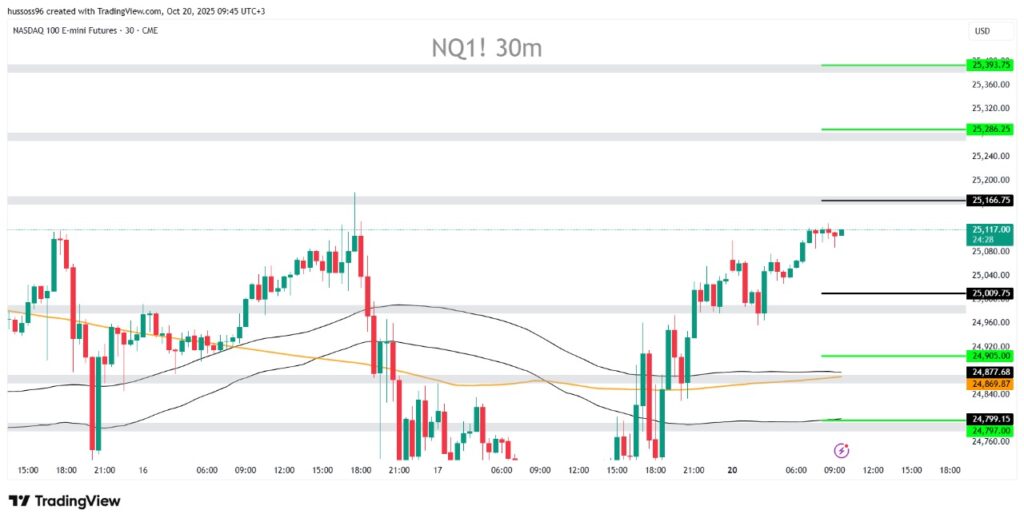 السيناريو الأول: شراء ناسداك باختراق والثبات أعلى 25,166 مع استهداف 25,286 ثم 25,393