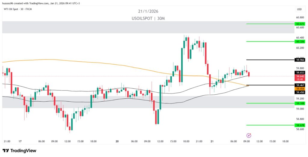 ملاحظة: السعر يتماسك فوق دعم مهم، واختراق 59.96 يفتح المجال لاستكمال الصعود.