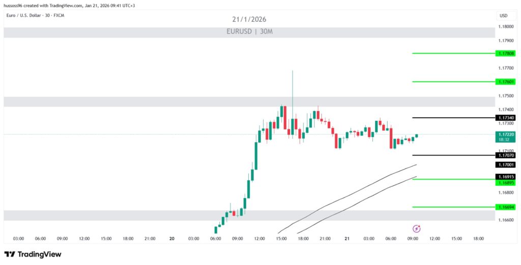 ملاحظة: الحركة الحالية عرضية بعد اندفاع قوي، والاستمرار الصاعد مشروط بالثبات أعلى 1.1734.