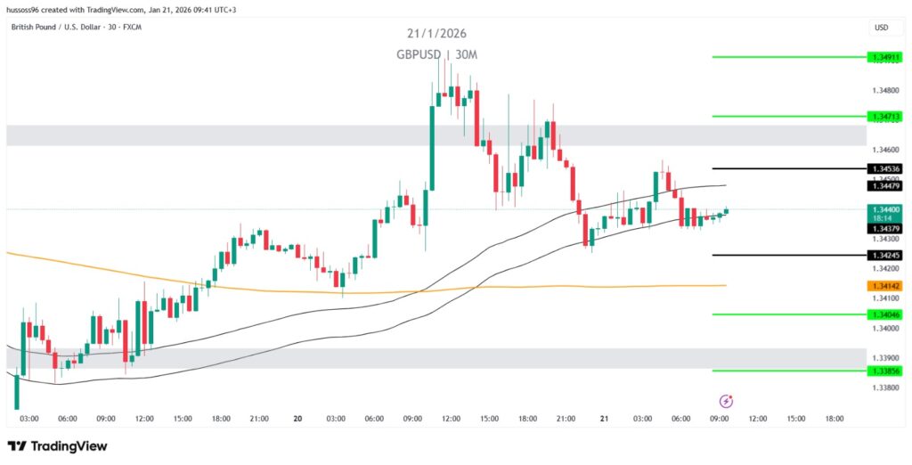 ملاحظة: الزوج يحافظ على قاع صاعد، لكن الفشل أعلى 1.3453 قد يعيد الضغط البيعي.