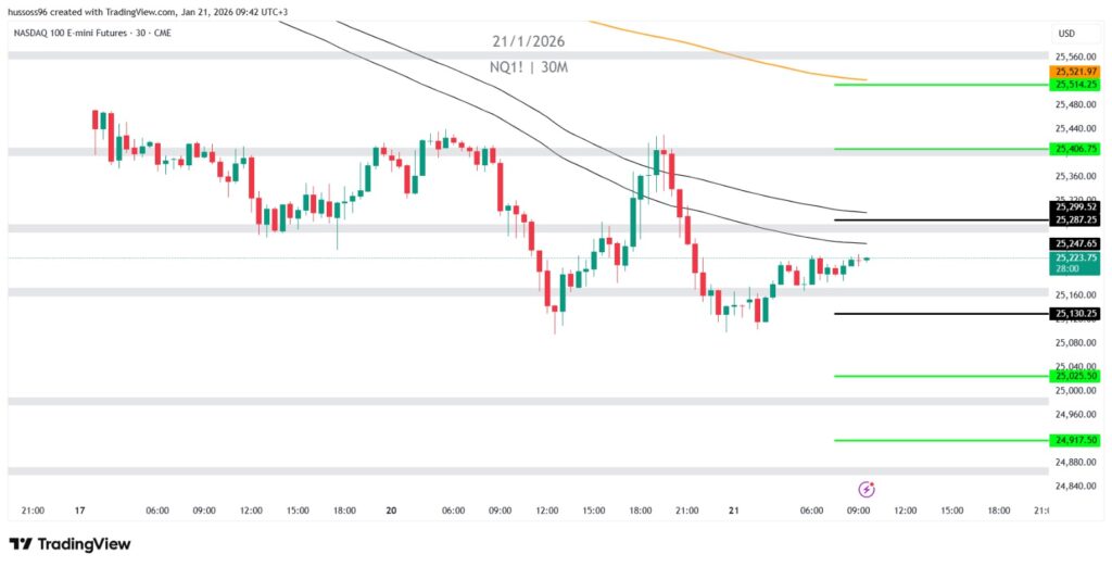 ملاحظة: السعر يتحرك أسفل المتوسطات الهابطة، والارتداد الحالي يبقى ضعيفاً ما لم يتم اختراق 25,287.