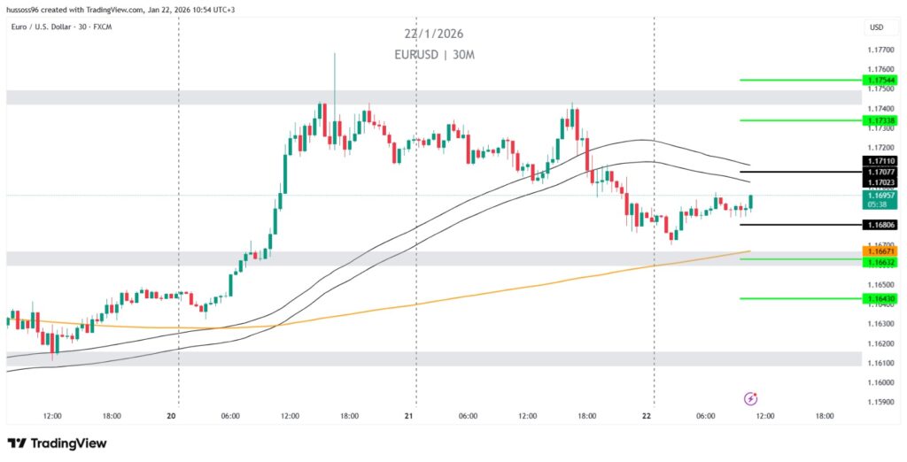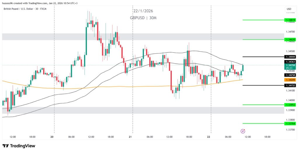 ملاحظة: الزوج تحت ضغط من المتوسطات المتحركة، وما زال التداول أسفل المقاومة الرئيسية، لذلك الأفضلية تبقى للبيع ما لم يحدث اختراق واضح.