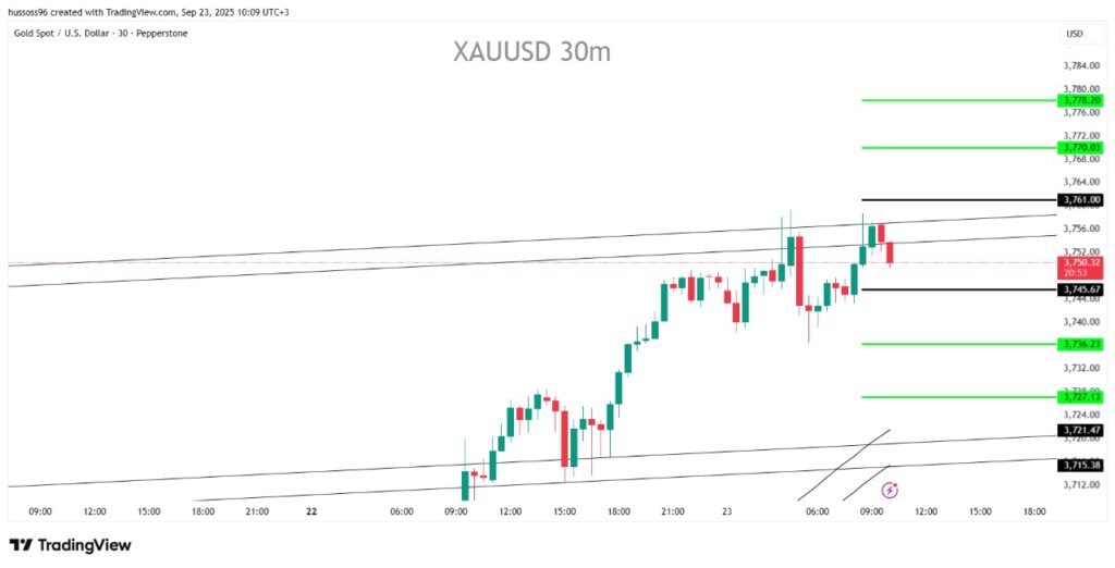 التعليق: الذهب يتحرك داخل قناة صاعدة، أي اختراق فوق 3,761 يعزز استكمال الاتجاه الصاعد.