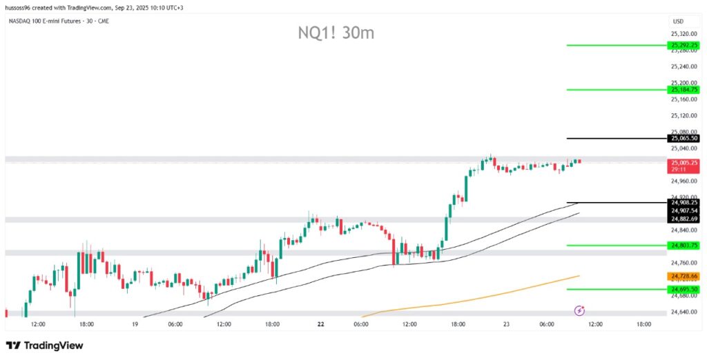 السيناريو الأول: شراء ناسداك باختراق والثبات أعلى 25,065.50 مع استهداف 25,184.75 ثم 25,292.25