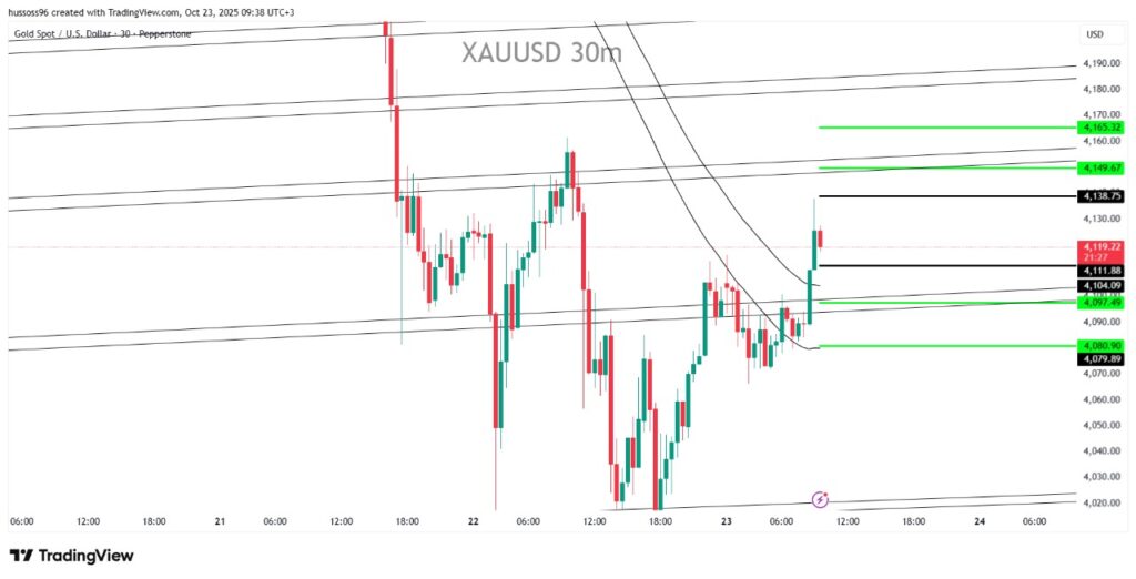 التعليق: الذهب ارتد من دعم 4,080 بقوة، لكن منطقة 4,138 تشكل مقاومة مهمة حالياً، واختراقها سيفتح المجال لموجة صعود قصيرة الأجل.