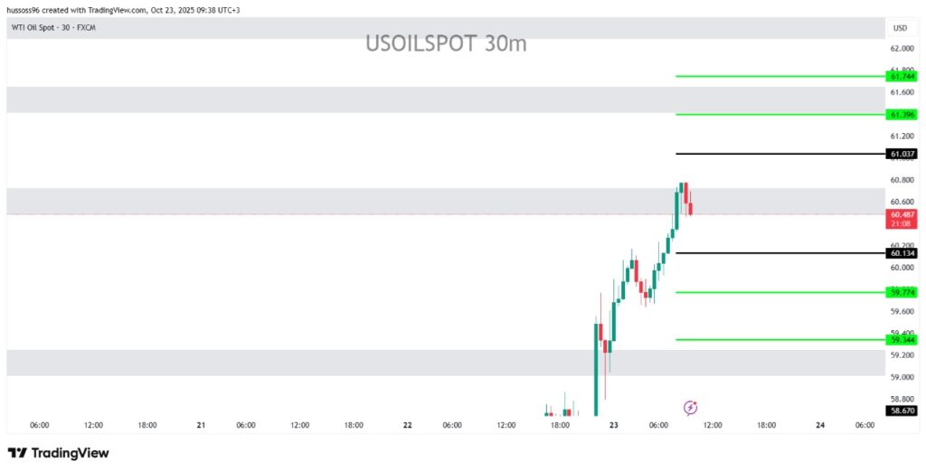 التعليق: النفط يشهد زخم قوي مدفوع بعمليات شراء واضحة، لكن قربه من منطقة العرض 61.00 قد يدفع لتصحيح قبل أي صعود جديد.