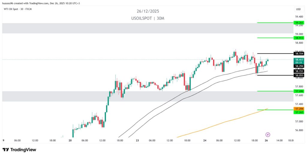 ملاحظة: النفط يحترم المتوسطات، والحركة الحالية تجميع قبل استكمال الاتجاه.