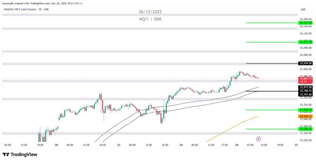 ملاحظة: المؤشر دخل حركة تصحيح خفيفة بعد صعود قوي، والاتجاه يبقى إيجابيًا أعلى 25,798.