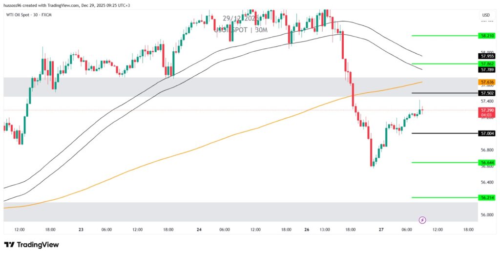 ملاحظة: النفط كسر هيكل صاعد سابق، وأي صعود حالي يُعد تصحيحيًا ما دون 57.50.