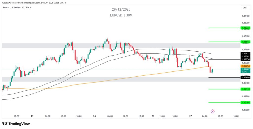 ملاحظة: السعر تحت المتوسطات مع ضغط بيعي، والارتدادات تبقى ضعيفة ما لم يعود أعلى 1.1775.