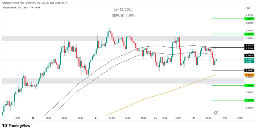 ملاحظة: الزوج فشل في الثبات أعلى 1.350، والتداول ما زال داخل نطاق واضح.