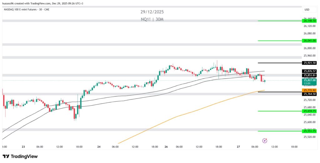 ملاحظة: المؤشر يتداول أسفل مقاومة 25,921 مع ضعف الزخم، وكسر 25,772 قد يفتح تصحيح أعمق نحو المتوسطات.