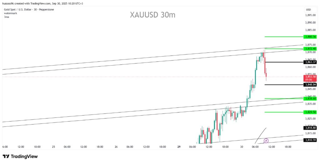 التعليق: الذهب شهد اندفاع قوي صباح اليوم، وأي اختراق لمستوى 3,863 سيؤكد استمرار الموجة الصاعدة.
