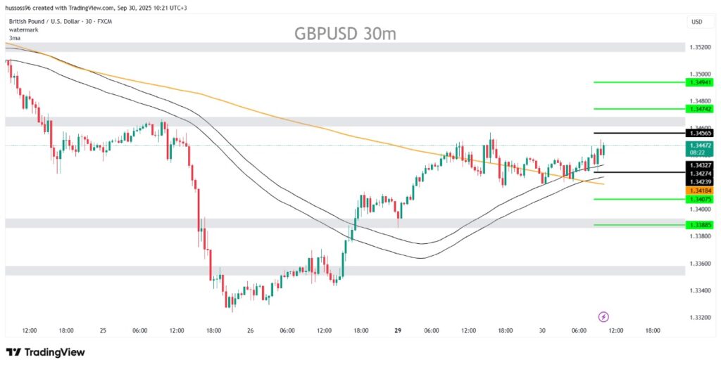 السيناريو الأول: شراء الباوند باختراق والثبات أعلى 1.3456 مع استهداف 1.3474 ثم 1.3494