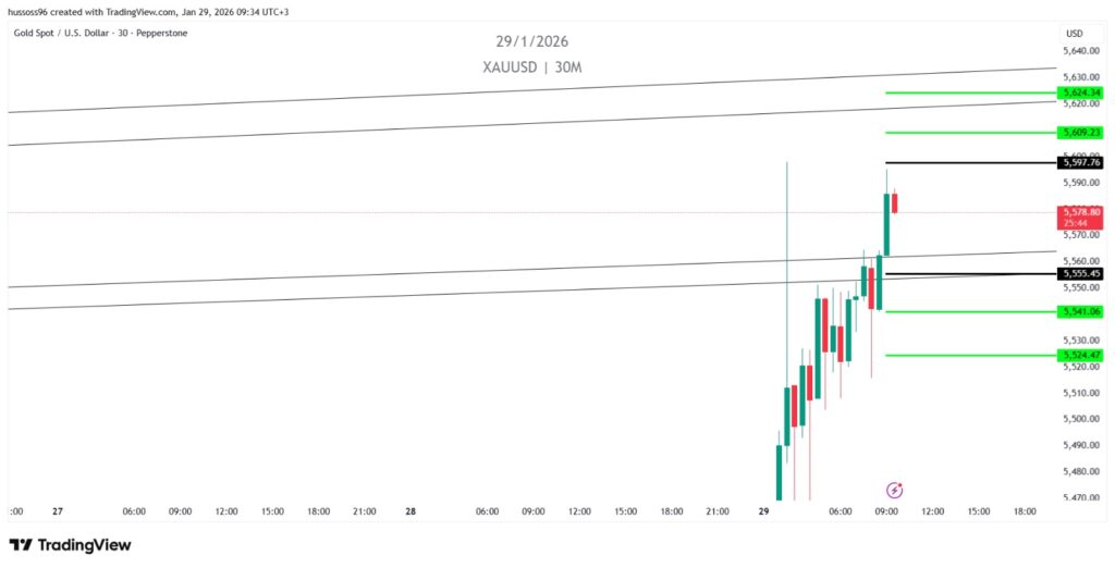 ملاحظة: الذهب في تسارع صاعد قوي، أي هبوط حالياً يعتبر تصحيح وفرصة إعادة شراء.