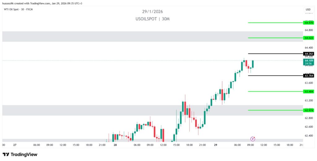 ملاحظة: النفط في موجة اندفاع قوية، البيع عكس الاتجاه حالياً مخاطرة إلا بعد كسر واضح للدعم.