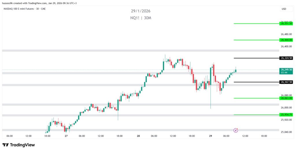 ملاحظة: الاتجاه العام لا يزال صاعد، والهبوط الحالي مجرد إعادة اختبار للطلب. طالما فوق 26,063 الزخم الشرائي مسيطر.