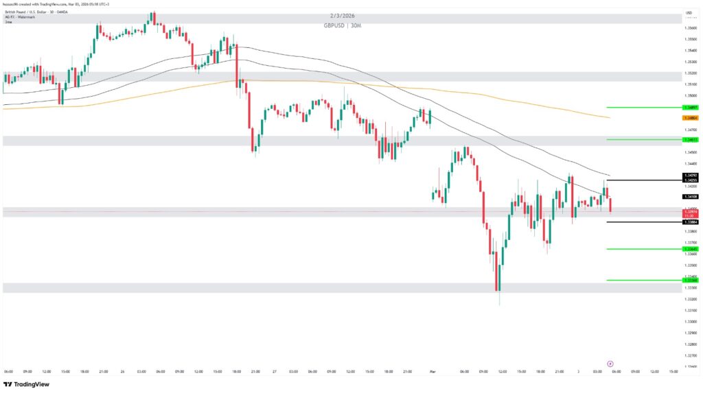 ملاحظة: الزوج يتداول تحت مقاومة واضحة، والثبات أسفل 1.34108 يبقي الضغط البيعي قائم.