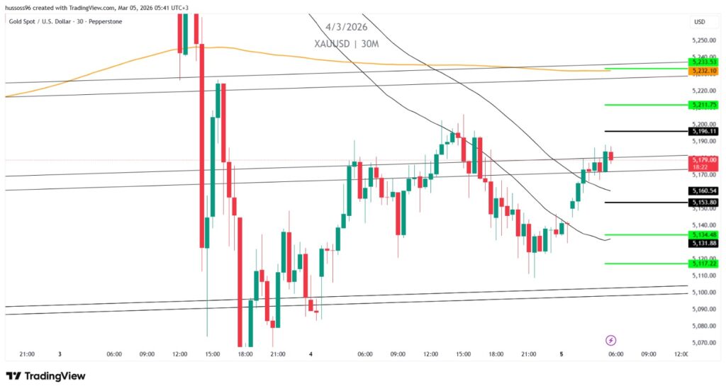 ملاحظة: الذهب يتحرك داخل موجة تصحيح صاعدة بعد هبوط قوي، واختراق 5,196 قد يفتح الطريق نحو مناطق العرض الأعلى.