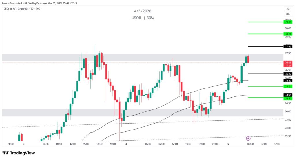 ملاحظة: النفط يحافظ على زخم صاعد واضح، وأي تصحيح نحو 75.51 قد يمثل إعادة اختبار للدعم.