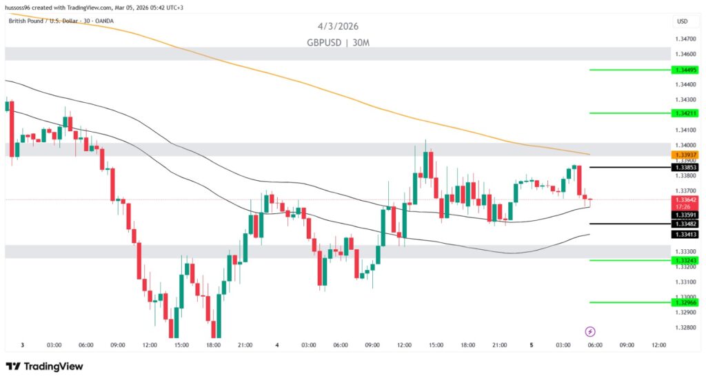 ملاحظة: الزوج يتداول داخل نطاق تذبذب، واختراق 1.33853 قد يدفع السعر لإعادة اختبار مناطق العرض الأعلى.