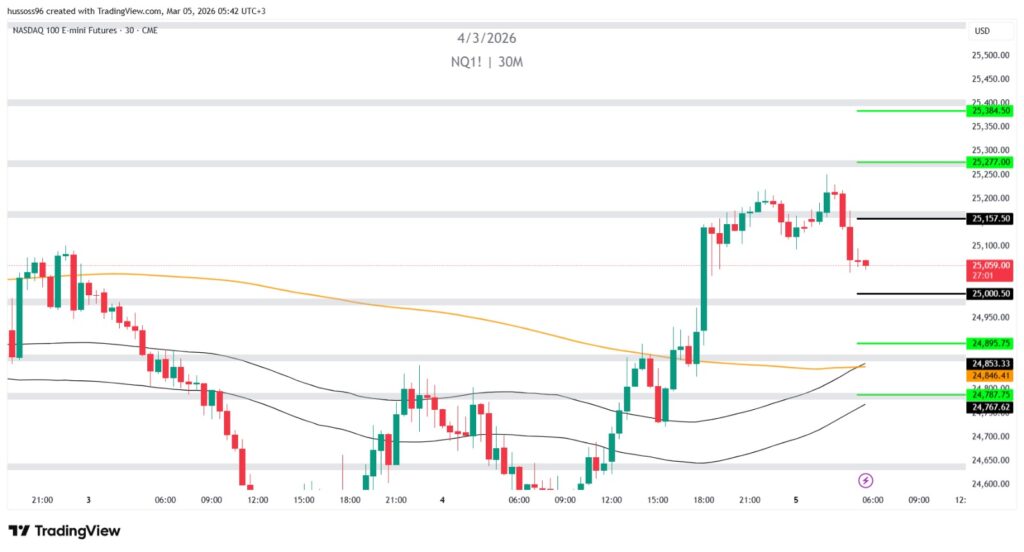 ملاحظة: المؤشر يتحرك أعلى المتوسطات بعد موجة صعود قوية، وأي هبوط حالياً يعتبر تصحيح ما لم يتم كسر 25,000