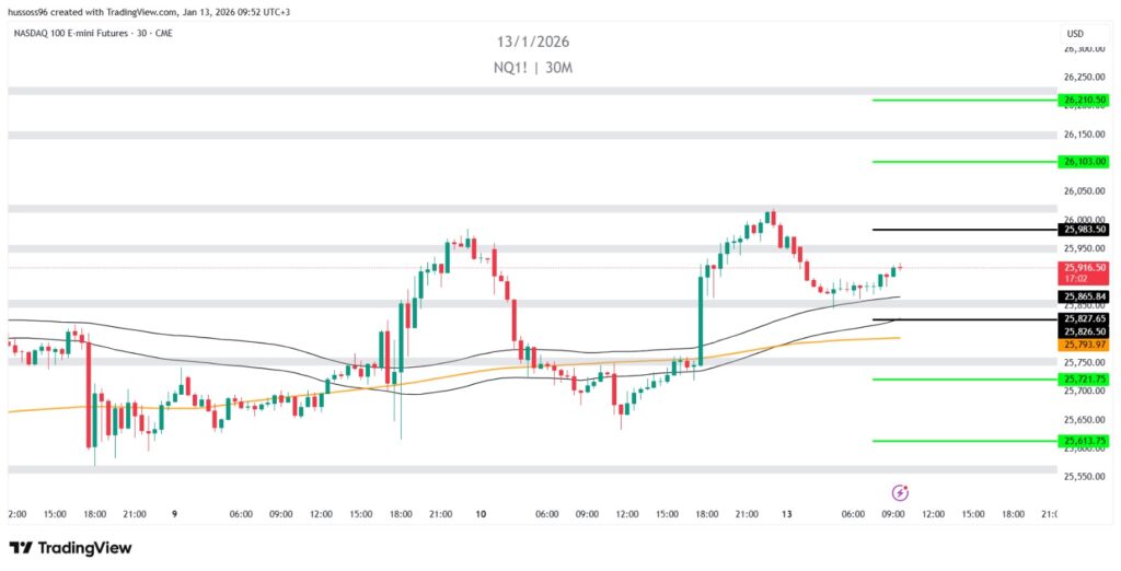 ملاحظة: السعر يتحرك داخل نطاق عرضي بعد صعود قوي، والاختراق أعلى 25,983 شرط لاستمرار الزخم الصاعد.
