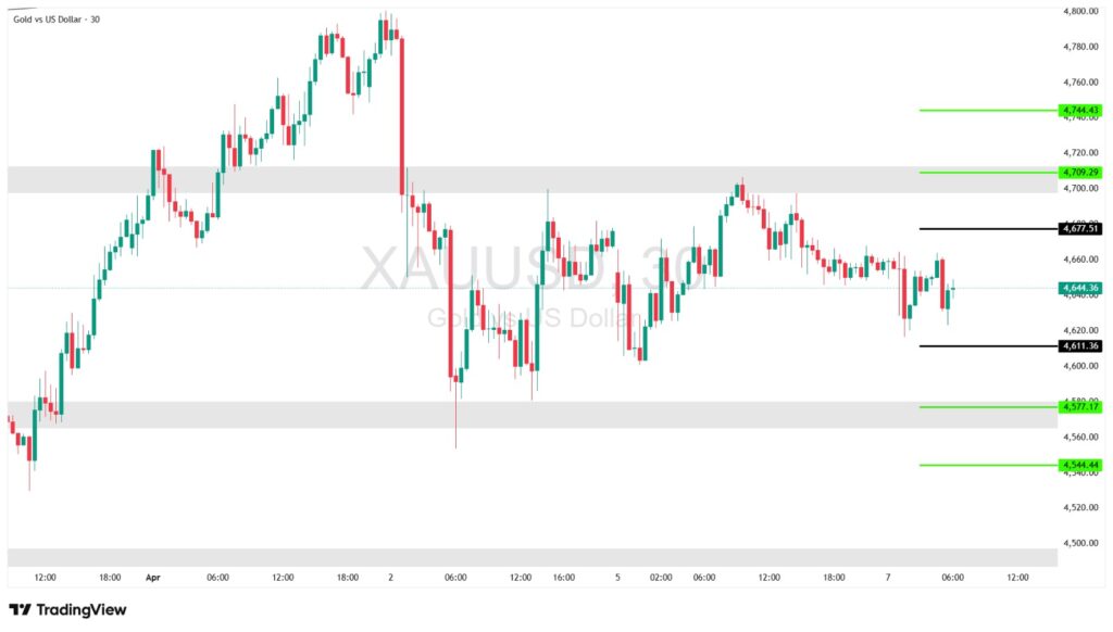 ملاحظة: الذهب في تذبذب بعد هبوط، والاتجاه غير واضح إلا بعد كسر أحد الطرفين.