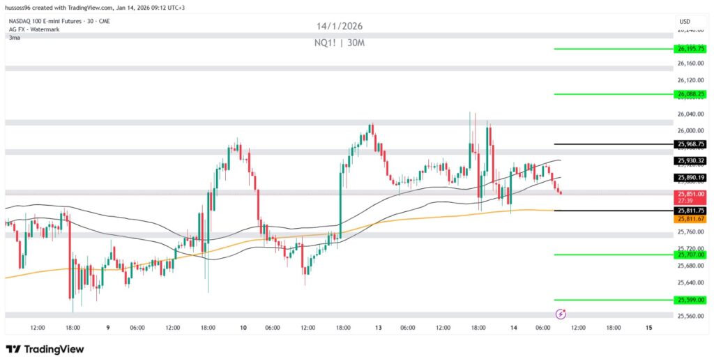 ملاحظة: السعر يتحرك داخل نطاق عرضي بعد صعود قوي، والاختراق أعلى 25,983 شرط لاستمرار الزخم الصاعد.