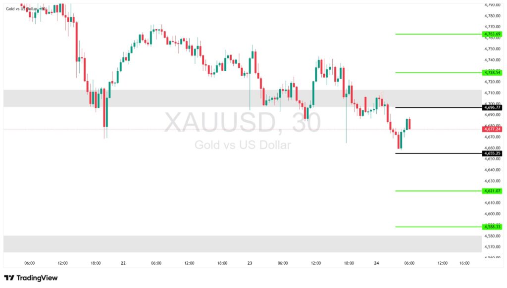 ملاحظة: الذهب تحت ضغط بيعي واضح، والحركة الحالية تصحيح داخل اتجاه هابط.